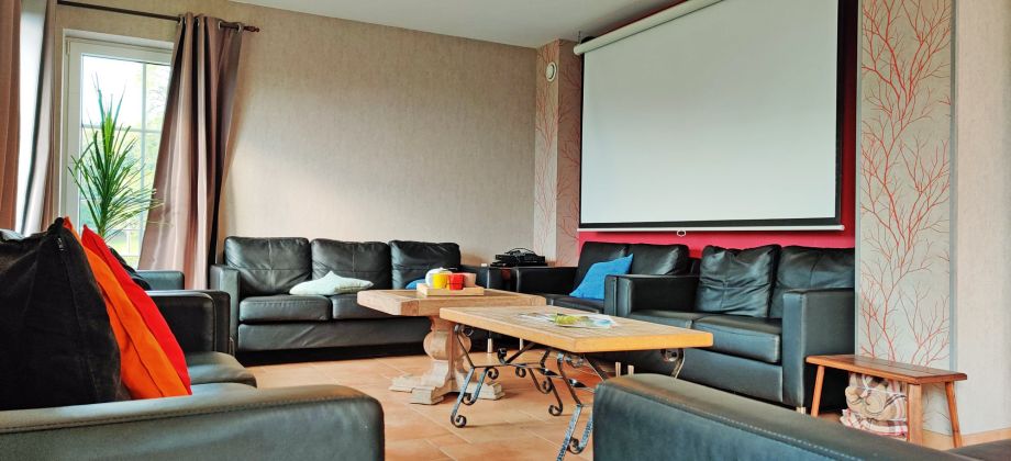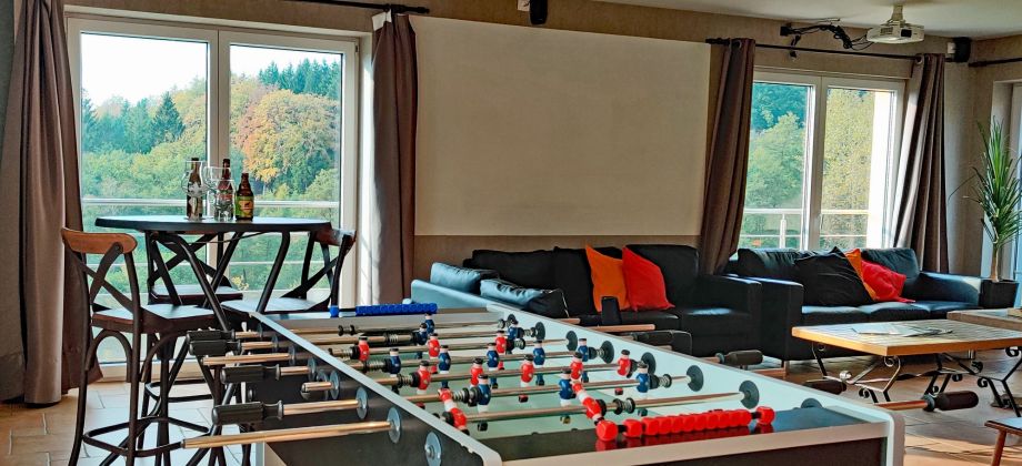 Salon confortable avec baby-foot, écran géant et projecteur