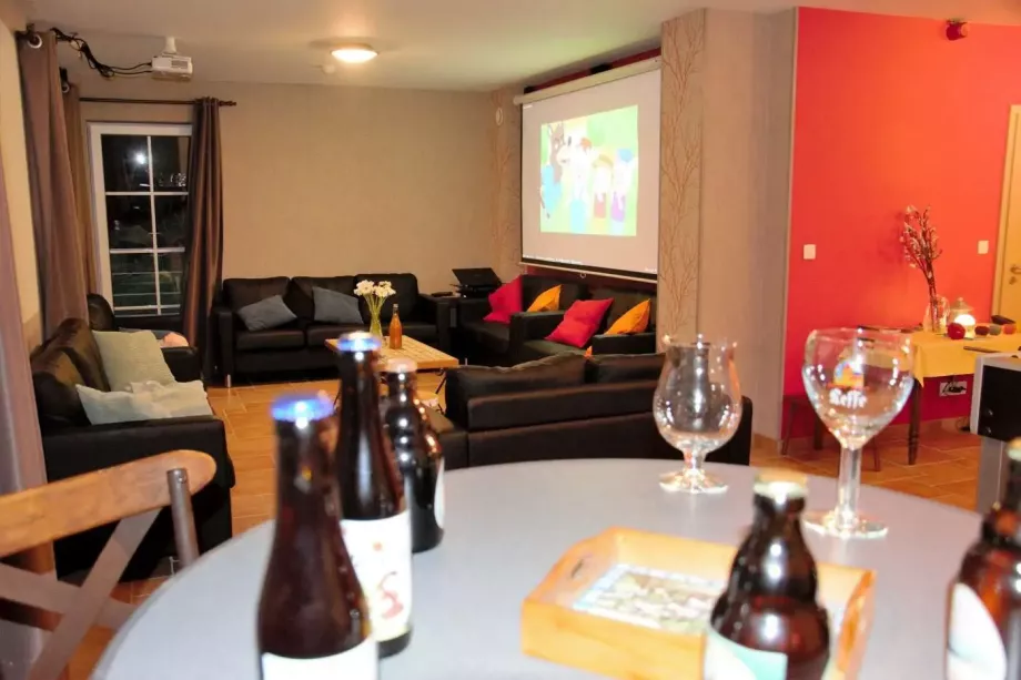 Salon confortable avec baby-foot, écran géant et projecteur